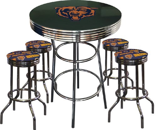 Features5 Piece Set!Glass Table TopComes with 4 Chicago Bears Bar Stools!Chicago Bears Themed Table Top Chicago Bears Logo Glass Top Chrome Bar Pub Table Set with 4 Swivel Bar Stools?