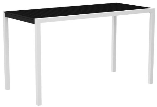 73.12 in. Modern Bar Table in Black w Textured White Frame?Includes hardware pack and assembly tool. Eco friendly. Solid, heavy-duty construction. Commercial grade stainless steel hardware. Easy to clean with soap and water. Warranty: Twenty years limited on residential and one year on commercial use. Made from high quality textured aluminum and high-density polyethylene lumber. Made in USA. 73.12 in. L x 35.18 in. W x 42 in. H (79 lbs.). Care Instruction. Assembly Instruction Reserved for evenings and weekends, this bar height table is designed to create memories. This product does not splinter, crack, chip, peel or rot and it is resistant to corrosive substances, insects, fungi, salt spray and other environmental stresses, by providing the look of painted wood without the maintenance. Polywood lumber requires no painting, staining, waterproofing or similar maintenance.