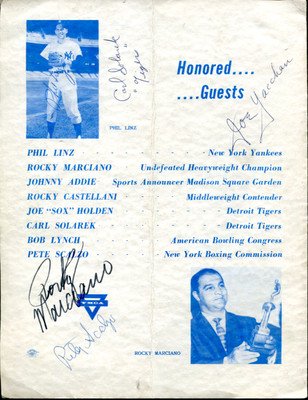 #OCKY MARCIANO SIGNED AUTOGRAPHED 1965 YMCA PROGRAM PSA/DNA PSA/DNA Certification #P10820 Offered a YMCA Sport Banquet multi signed program by Rocky Marciano, Jim Honochick, Rocky Castellani, Phil Linz, Carl Solarek, Joe Yacchan and Pete Scalzo . Signed in blue and black sharpie and pen by Rocky Marciano and others the signature projects 8-9. The program is nice. Comes with PSA/DNA Full Loa. This autograph is guaranteed authentic and has been certified by PSA/DNA, the authority on autograph authentication.