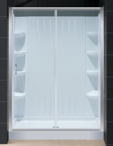 DreamLine DL-6103R-01CL Infinity Clear Glass Shower Door, Amazon 30" x 60" Right Drain Tray and Back?DreamLine DL-6103R-01CL Infinity Clear Glass Shower Door, Amazon 30" x 60" Right Drain Tray and Back Wall Combo, Chrome Combine DreamLine universal shower wall panels with a tub replacement AMAZON shower base and a large sliding INFINITY shower door for a complete shower kit. This kit is perfect for a bathroom remodeling or tub-to-shower conversion project and is designed to be installed over existing solid surfaces. DreamLine DL-6103R-01CL Infinity Clear Glass Shower Door, Amazon 30" x 60" Right Drain Tray and Back Wall Combo, Chrome Features: DreamLine tub replacement kit 60 inch : white base with sliding clear glass or frosted door and white walls Advanced design for fast installation over existing solid surface (over existing tile, concrete sheet material, etc.) Drain location options for tray (center, right or left) provide flexibility of installation with minimal plumbing changes Sliding door provide wide entry into the shower and include fast wheel release mechanisms for easy glass and bottom track cleaning Shower base includes slip-resistant floor design and fiber glass reinforcement for durability 6 integrated soap or accessory shelves 2 Convenience corner foot rest Unique water proof connection of 2 sidewalls, 2 corner panels and 1 back panel Trim-to-Size sidewall design (side walls must be trimmed to size during installation) Wall system is specially designed to be installed over existing solid surface not directly against the studs Slip-resistant textured floor for safe bathing Integrated tile flanges for easy installation and waterproofing Fiberglass reinforcement for durability Raised edge to prevent water leakage over the threshold Comes with opening ready for standard compression fitting drain (drain not included) Single sliding door design Tempered 1/4 inch clear glass Reversible for left or right door opening Anodized aluminum profiles and frames in a choice of chrome, brushed nickel or white finish Full length strips on sliding door edges for wate