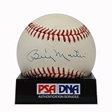 Billy Martin Signed Baseball, PSA/DNABilly Martin (d.1989) was a player and manager in MLB. Most famous as a manager, Martin posted a career record of 1,253-1,013. Martin managed the Yankees in short stints, the longest between 1975-1978. Martin won a World Series with the Yankees as manager in 1977 as well as winning it as the Yankees second basemen in 1951, 1952, 1953, 1956. Best known for his frequent altercations, Martin had problems with owner George Steinbrenner which led to his firing many times. This ball is an official American League (pres. Brown) baseball. This comes with an official Letter of Authenticity from PSA/DNA.