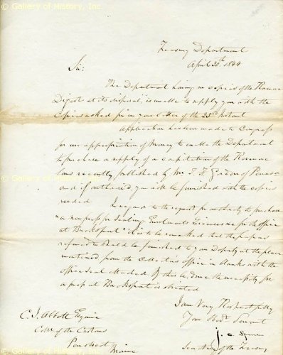 | JOHN C. SPENCER - MANUSCRIPT LETTER SIGNED 04/30/1844 #JOHN C. SPENCER As Secretary of the Treasury, his Supreme Court nomination recently rejected by the Senate (1844), he blames inadequate Congressional funding for his inability to send requested copies of documents. Manuscript Letter signed: "J. C. Spencer" as Secretary of the Treasury, 1 page, 8x10. Treasury Department, 1844 April 30. To C. J. Abbott, Collector of the Customs, Penobscot, Maine. In full: "The Department having no copies of the Revenue Digest at its disposal, is unable to supply you with the copies requested in your letter of the 2nd Instant. Application has been made to Congress for an appropriation of money to enable the Department to purchase a supply of a compilation of the Revenue Laws recently published by Mr. T. H. Gordon of Pennsylvania, and if authorized you will be furnished with the copies needed. In regard to the request for authority to purchase 'a new press for sealing enrollment licenses and for the office at Bucksport, it is to be remarked that the papers referred to should be furnished to your Deputy at the place mentioned from the Collector's office in blanks with the official seal attached. If this be done, the necessity for a press at Bucksport is obviated. I am very respectfully your obedient servant". John Canfield Spencer (1788-1855), a judge advocate during the War of 1812, represented his New York district in the US House of Representatives as a Democratic-Republican (1817-1819), but vacated the seat in an unsuccessful effort to become US Senator. For the next two decades, he was a New York legislator and district attorney. Appointed special prosecutor in 1826, he helped incite the anti-Masonic movement, claiming that the Masons were a conspiracy aimed at controlling the country. Spencer hosted Alexis de Tocqueville during the latter's tour of upstate New York, and later edited the English-language edition of... For more information contact HistoryForSale. DOCUMENT 17175 JOHN C. SPENCER - MANUSCRIPT LETTER SIGNED 04/30/1844 . FeaturesA memorable & special gift!A unique centerpiece for the home or office!Only 100% Authentic Autographs & Manuscripts - Certificate of Authenticity Provided.UACC Registered Dealer, #RD110 and member of the Manuscript Society!Fast Worldwide shipping! JOHN C. SPENCER - MANUSCRIPT LETTER SIGNED 04/30/1844?Looking for JOHN C. SPENCER - MANUSCRIPT LETTER SIGNED 04/30/1844 Great Deals, Shop Online, Read JOHN C. SPENCER - MANUSCRIPT LETTER SIGNED 04/30/1844 Product Review, Features, Specs, Description, Check Prices Update & More Satisfactory for This Product Reviews !!! Miscellaneous tips • If you want to buy JOHN C. SPENCER - MANUSCRIPT LETTER SIGNED 04/30/1844 can try to find detailed descriptions and product details. • reading the review, you will provide a much more complete understanding of the advantages and disadvantages of the needed products. • You can try to find a similar item, and sometimes choose to purchase will help. • You may want to try to look up the discussion. • Get the details and information provided for each product. • You can try to find the product features. • In general, as far as I know from the Internet or other JOHN C. SPENCER - MANUSCRIPT LETTER SIGNED 04/30/1844 product Customers who bought the points and shops, shipping, gift ideas, city trading, sales, coupons online, new, holiday, and review, Cheap & Low Prices were interested in best products, including day trading, trading, JOHN C. SPENCER - MANUSCRIPT LETTER SIGNED 04/30/1844 special events, the best deal, discount coupons, best & hot deal, plan, at the last minute deal ... |