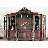 9624/SET Features: -Home entertainment center.-Custom antique hardware.-Beveled glass.-Intricate resin carvings.-Triple hinged doors.-Top lighting.-Six storage cabinets.-Four shelves. Construction: -Solid hardwood and veneer construction. Color/Finish: -Distressed Dark Cherry finish. Assembly Instructions: -Assembly required. Collection: -Heritage collection. Warranty: -Manufacturer provides 6 months limited warranty against product defects.