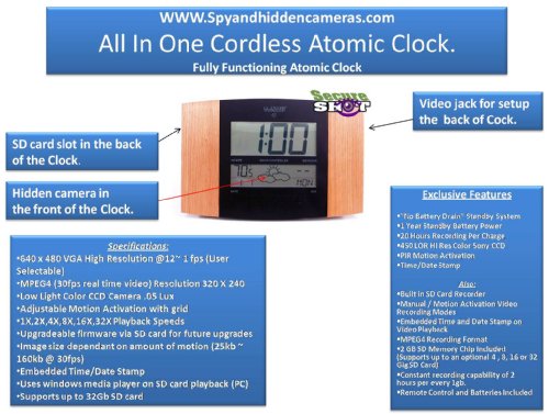 #No more power cords required! Our totally portable SecureShot atomic wall/desk clock can quickly be placed in any indoor location without the worry of AC outlets or extension cords. With our exclusive copyrighted micro PIR motion activation system, there is virtually no battery drain while on standby, and no false alarms. As soon as "body heat" is detected, up to 30 feet away, hi resolution (640 X 480) video is recorded on a hidden SD card. Recording continues until 1 minute after motion ceases, then unit automatically returns to standby mode. Rechargeable high capacity Li-ion battery offers 1 year of standby operation and over 20 hours of actual recording per charge. Recordings can be played back to TV/VCR directly from unit, or SD card can be removed from hidden compartment and played on your PC.
